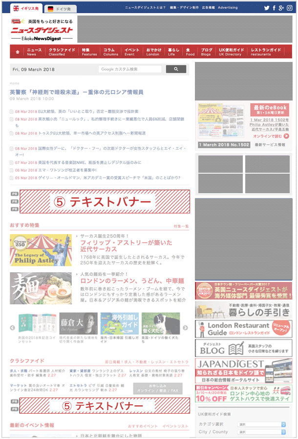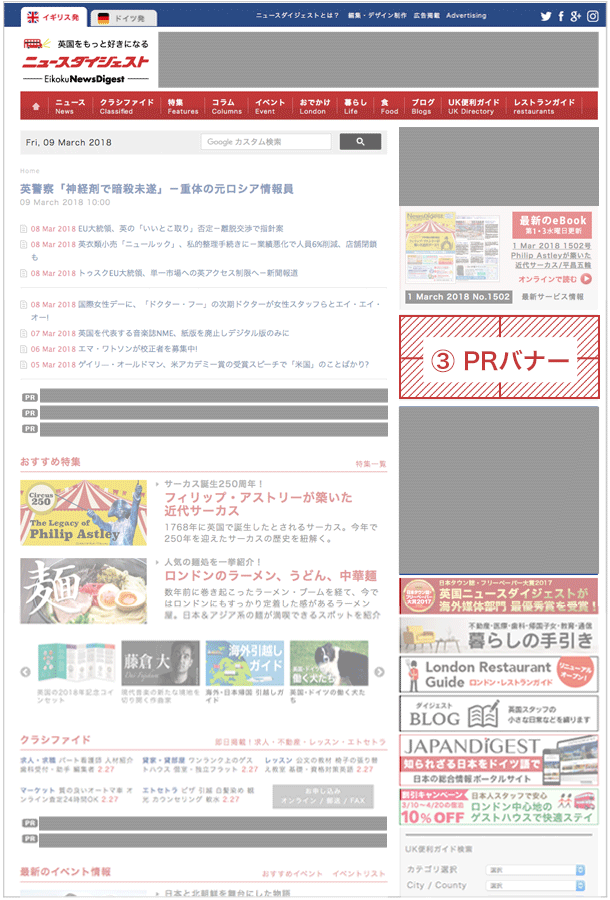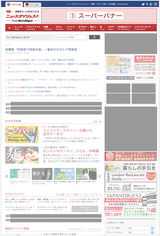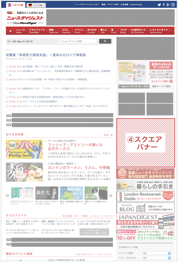各種バナーの中で最も多くのページに表示され、英国ニュースダイジェスト掲載のバナーの中で最大のインプレッション数を期待出来るバナーです。サイト右カラム上部に設置され、視覚的にも目を引く工夫が凝らされています。